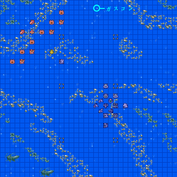 | 攻略要点: 后半场战斗可谓艰难,如果不想过于纠缠的话,建议让主角进入指定地点。左右两侧的敌人可以不理睬,集中全力打通上方的道路。充分利用MAP兵器是这话的关键。BOSSコンターギオ的HP有34500,将其削减到20%以下就会撤退。当击破17机以后,敌人援军会在BOSS下方出现。而后在敌机小于10的时候会出现6机增援。 |