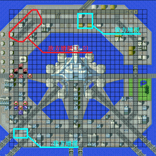 | 战术指南: 主角机的回避不错,加个集中后敌人几乎就打不到了。不过集中只能用4次,因为后面还有敌人出现,所以老爹还是尽快赶过去的好,而且用母舰反击一回合就能清版了。 敌人全灭后エイド队出现在地图上方,他们的实力也不怎么样,大伙一起上就清光了,或者用母舰加个必中再反击一回合也就差不多了…… |