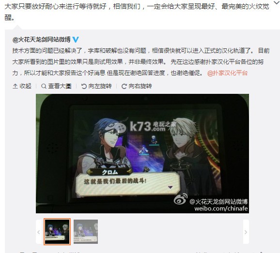 在3ds破解的虚拟系统破解的越来越高后,大量的汉化游戏也慢慢的推出了,在之前已经完成的《逆转裁判5》,正在汉化的《怪物猎人4》等,而在昨天之前谣传的《火焰纹章觉醒》的汉化消息也终于得到了确认。