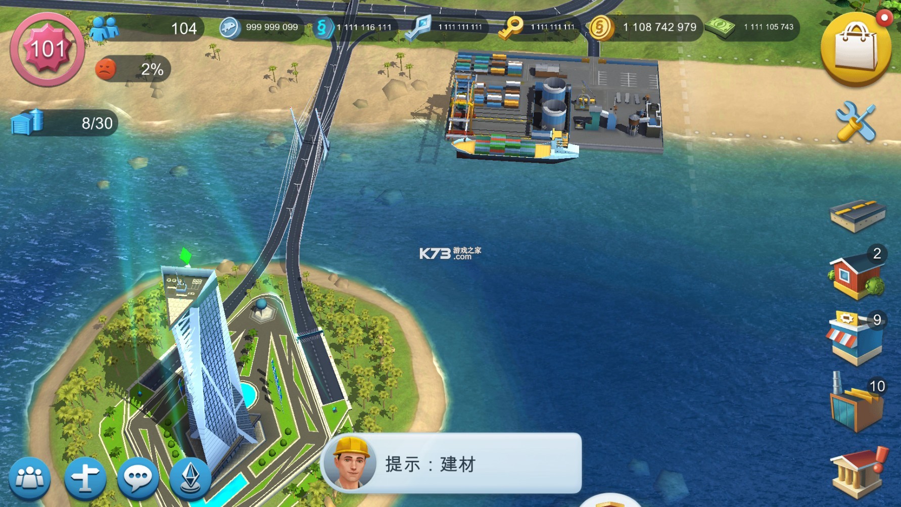 游戏中玩家可以随时调整视角,360度旋转城市,轻松管理和扩张城市。与好友和其他城市交易资源,完成船运订单,建造专属建筑物如自由女神像、凯旋门等,扩建水上乐园、游艇码头等。玩家还可以体验发动各种自然和非自然的灾害,解决现实生活中的挑战,如交通问题、火灾和污染等。