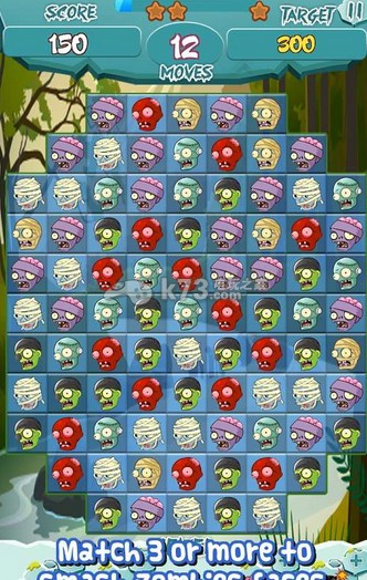 《粉碎僵尸(Zombie Match Smash)》采用了植物大战僵尸中的僵尸造型,通过消除玩法让玩家和他们进行紧张的互动,如果未在条件内达到消除要求可是会被僵尸吃掉脑子的哦。