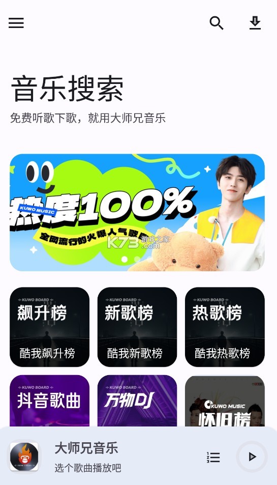 《大师兄音乐》app1.3.1版本为大家更新了,新的版本,新的功能,直接下载最新版进入听歌就可以了。主页直接点击歌曲分类榜单,推荐更多精彩音乐给大家,免费直接听歌,免费下载歌曲,更快捷更方便。