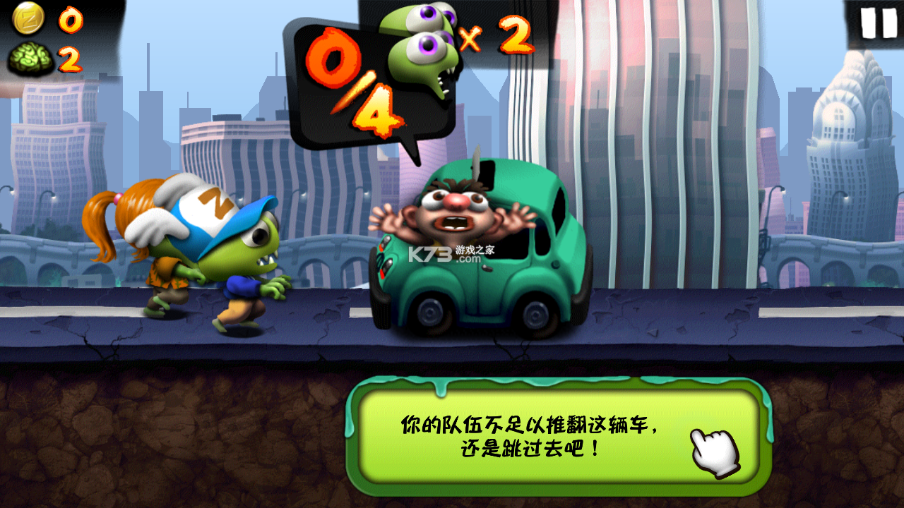 有趣的横版跑酷游戏。加入了很多其它跑酷游戏没有的新要素,路上会有一些问号的箱子,当玩家吃到带有问号白色方块,僵尸就会进行变身得到特殊的效果,种类相当多。例如:巨大僵尸会发出镭射来消灭所有障碍物跟陷阱;UFO可以持续复制僵尸给玩家,不用吃人也可以增加僵尸数目;橄榄球队则是带着勇往直前的气势来撞飞所有车辆;忍者可以施展相当方便的二段跳跃;舞龙形态跳起落下的时候连续点击屏幕可以进行滑行等等。