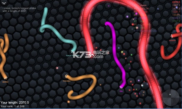 游戏中我们通过收集地面上的能量来增长体型,而随着体型的增长,蛇蛇的移动速度会变慢,体型越大,移动速度就越慢,所以玩家们可以利用这个规则去进行“捕猎”,因为当有其他玩家的蛇蛇头部碰撞到我们蛇蛇身体任何部位的时候,对方即可被杀死,并且化为能量体,我们就可以收集对手所爆出的能量体迅速成长。游戏加入了战斗元素,玩家们通过控制蛇蛇来阻挡敌人,通过各种技巧让敌人碰撞我们的身体而死亡,然后吸收对手的能量不断变强。对战环境一定是众多玩家们所青睐的,不过这里不得不说不管是小蛇还是大蛇都有自己的优缺点,玩家们处于不同的形态就要使用不同的策略才能更好的生存下来,这不仅考验玩家们的反应能力,也挑战着大家的策略思维。玩家们将进入一个黑色战场,控制一条蛇蛇收集能量,从弱小的体型不断的成长为庞大的身躯。游戏虽然是卡通2D画面,但是主角蛇蛇们却呈现出非常不俗的立体效果,而且加上身体蠕动的细节表现,在视觉上给玩家们一种真实的运动感觉,当然了对于不习惯的玩家来说,或许会觉得恶心。游戏加入了丰富的玩家交互系统,我们可以与其他玩家进行友好互动