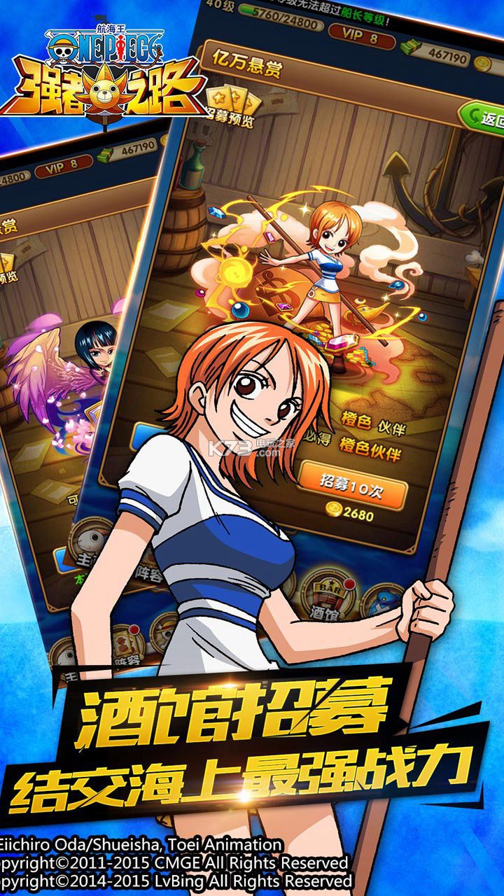 “ONE PIECE”动画正版授权手游《航海王强者之路》扬帆公测今日火爆开启,和小伙伴们一起,为梦想呐喊!超强红卡登场,顶级战力等你招募!跨服激斗,赢取属于海盗王者的荣耀!海岛争夺,公会对决火力全开!更有宠物等多样玩法火热开放!航海王动画经典还原,热血战斗等你加入!出发吧,成为我的伙伴!