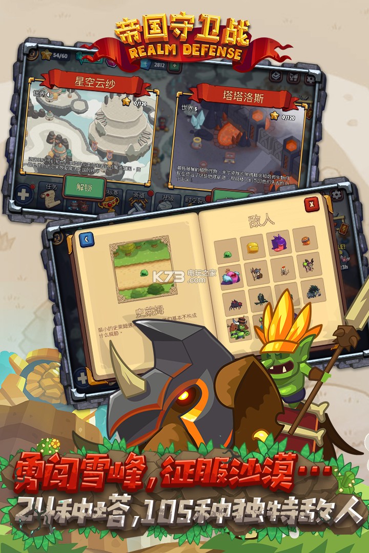 帝国保卫战是一款塔防游戏,对经验丰富的老玩家来说也富有挑战。使用一系列能量和魔法在100多个关卡中消灭一波又一波的敌军威胁。穿越茂密的森林和冰雪覆盖的山脉,打败一批批由黏液怪物,哥布林,骷髅和更多怪物组成的敌军。