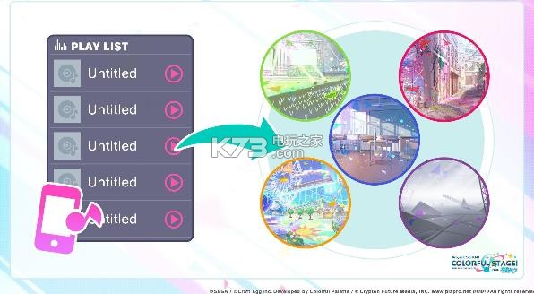 游戏中有 5 个拥有不同念想与世界的乐团,包括代表乐队的「Leo/need」、代表偶像的「More More Jump!」、代表街头的「Vivid Bad Squad」、代表音乐剧的「Wonderlands × Showtime」与代表地下风格的「25 点,Night Code 中」。