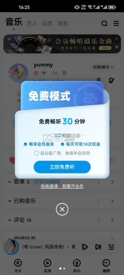 完成后会自动弹出界面,点击界面中【X】,就可以免费听VIP歌曲了;