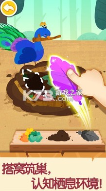 孔雀公主想住在林间草地,宝宝帮它打造舒适的家吧!先收集树枝、羽毛,用树枝拼搭出圆形的窝,接着铺满羽毛。孔雀公主的新家完成!