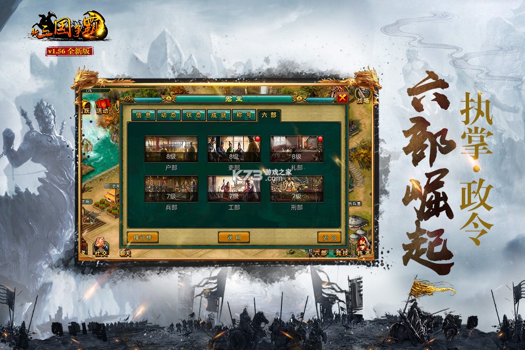 游戏由多个国家组成,友友选择加入其一,攻取城池成为城主后,可以建立属于自己的国家,通过不断地占领敌国城池扩大版图,最终统一天下。