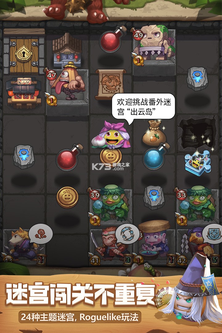 《不思议迷宫》在这里收集不靠脸,策略组合套路深,包含了大量的放置的玩法,上百个彩蛋等你探索,玩法各异的地图副本来袭,操作简单,个性十足策略组合给你不同的玩法,随机的游戏乐趣搭配解锁更多玩法。