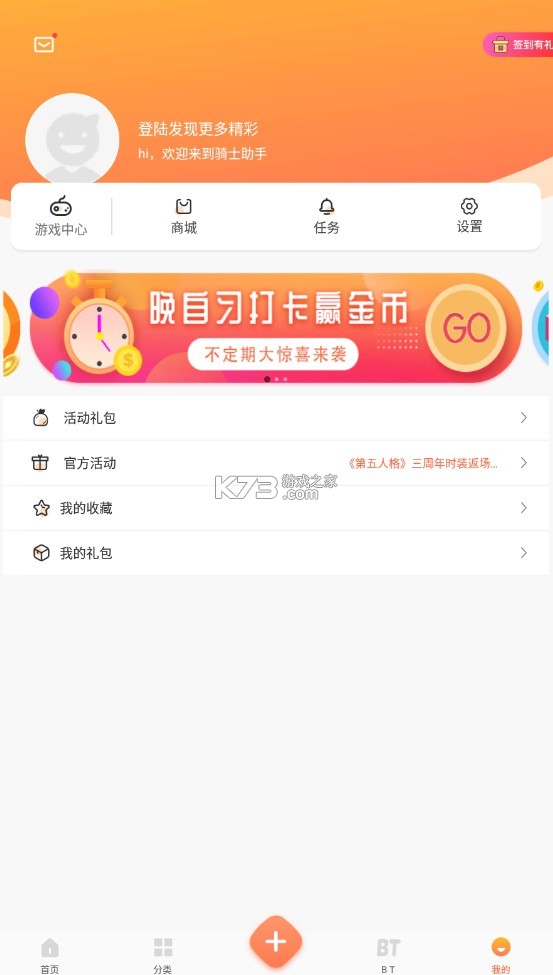 《骑士助手》app是来帮助大家进行更多游戏体验的一个平台,在骑士助手,您不仅能找到心仪的游戏,还能享受到丰富的游戏礼包和福利。我们为您准备了各种正版、修改的游戏,让您在游戏中畅享更多惊喜和特权。
