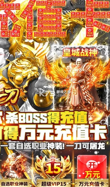 《烈火一刀-送万元充值》登录就送VIP15,元宝10w,金币500w,一套自选职业神装!一刀可屠龙。全民boss大狂欢,杀BOSS得充值,击杀送充,最高可得万元充值卡!