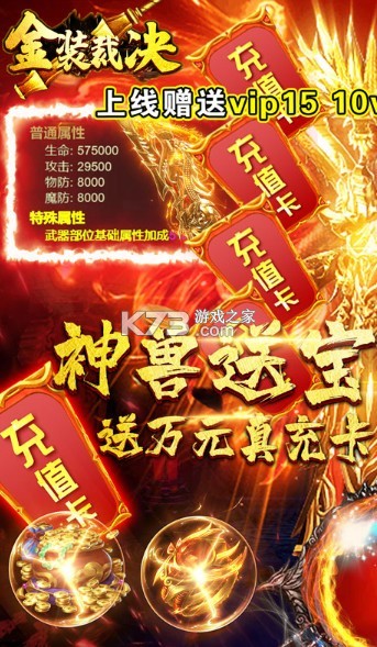 1、上线送vip15,元宝*10w,金币*10000万,再送绝版武圣关羽时装套