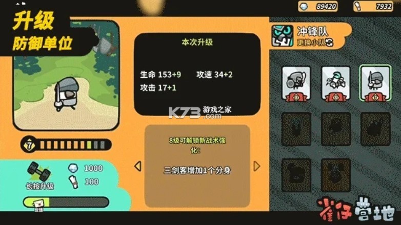 4.还可以升级你的防御单位,每次升级需要一定的钻石等,可以提升生命、攻速、攻提升到一定的等级后,还会解锁新战术强化技能;