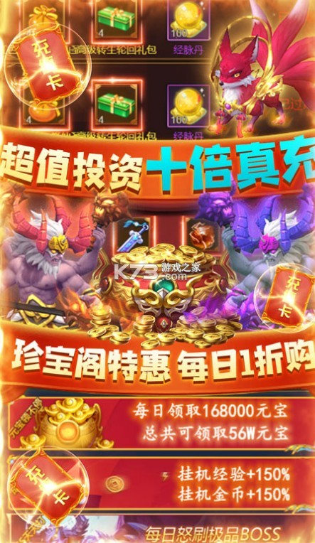 3、充值比例1:2000,首充20倍返利,仙魔装备套装,仙器神剑、富甲一方称号免费送!