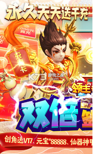1、开局免费送VIP17、元宝*88888、仙器神甲*1、时装-牛魔王、魔王之翼、金币*10000万!