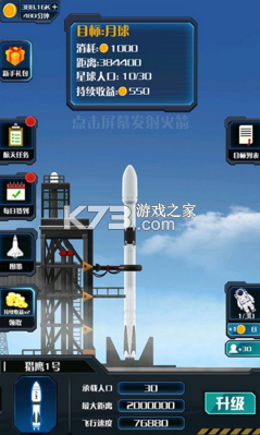 火箭遨游太空模拟是一款太空题材的休闲益智类游戏,火箭遨游太空模拟游戏画风休闲卡通,在火箭遨游太空模拟游戏之中玩家们依靠自己的技术,开始推动这些看起来比较难度的游戏关卡。你知道火箭的型号吗?你知道载人航天器吗?猜猜太空研究车是否?我们的计划就是开拓太空,摆脱地心引力,冲向平流层,当然这个最新的火箭飞行3D技术由你来操控,你来控制什么时候发射,点击发射一节燃料,在最合适的地方点击才能获得最大效果,能不能开拓太空就看你了,别忘了还可以升级,疯狂飞行器穿越天空游戏!利用你手中的火箭,把移民运送到外星中,实现我们的开拓计划!