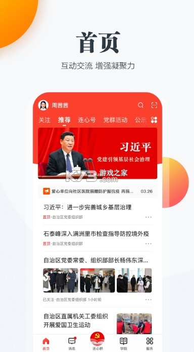 首页呈现多样的信息内容,包括推荐栏、重要党建资讯、公示信息和党群活动。推荐栏突出重要党建信息,为用户提供精选内容;同时,党群活动栏目展示众多丰富的活动信息,让用户随时随地参与。