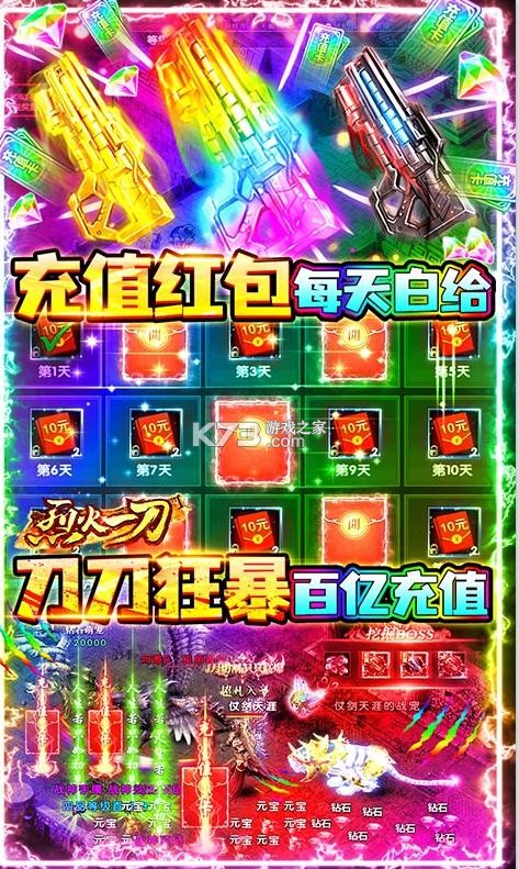 ★后缀说明:游戏上线可以领取充值卡和充值券,充值卡是限制转生等级使用,充值券是限制开服天数使用,使用后可获得对应钻石和下一个档位的充值卡,两种充值卡加起来一共是10W充值;点击左上角爆百亿充值UI进入到对应界面,只要击杀1000级以上的boss就有几率爆出充值,开通特权卡可以增加次数和提高爆出充值的金额;在专属boss地图和钻石会员地图击杀boss都有概率爆出充值红包;击杀boss后可以挖掘boss,有概率挖掘出钻石或其他道具。