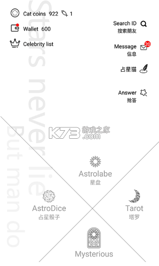 占星猫是一款创新独特的星座占星软件,凭借前卫的界面设计和精准的运势预测,深受用户喜爱。它能根据天体位置和运动,为你解读爱情、工作、财运等运势,新版本更增塔罗牌占卜功能,助你全面探索命运。