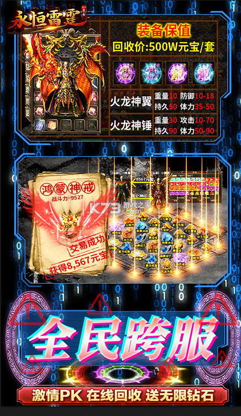 《永恒雷霆》上线送钻石20万,元宝1亿,战狂★魂环特权,创号免费领取,炫酷魂环外观。主线一点秒升百级,一款独创1秒99刀,无限攻速,百倍爆率,所有装备,所有特殊装备以及材料游戏内全部能爆。