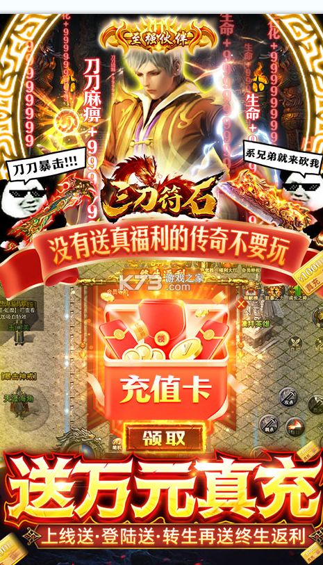 《三刀符石》玩经典打造原汁原味的游戏体验感,魂环三职业的玩法,送真福利刀刀麻痹,送万元真充天天返充值,人人都能当大哥,王者峡谷爆无限充值,极品装备全靠打,开启终身返利,领取充值卡。