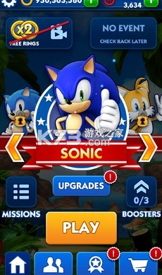 游戏中遇到FACEBOOK登陆提示时,点击红叉关闭即可;游戏需要网络验证,请保持网络畅通,如加载界面过不去请尝试断开网络进入。 《索尼克冲刺》是一款跑酷游戏。游戏沿袭了经典的索尼克造型,一路飞奔,收集金环,躲避障碍等。索尼克将以招牌式的冲刺动作,闯过各种关卡,击退BOSS,最终到达终点。游戏中仍然有一些《刺猬索尼克》的经典动作,熟悉的角色依然会让大家感到快乐,怎会有人不喜欢索尼克呢?
