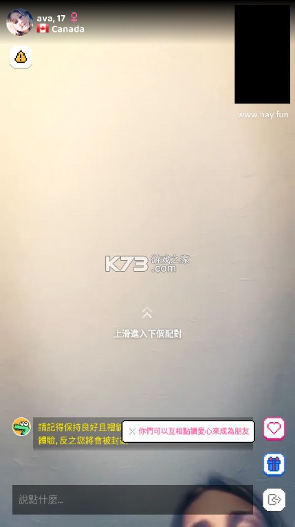 2.文字匹配:你还在为面对面和陌生人聊天害羞吗?你还在为不能随时随地使用Hay而烦恼吗?Hay隆重推出了文字匹配聊天,让你更加轻松自由地跟陌生人say hi。