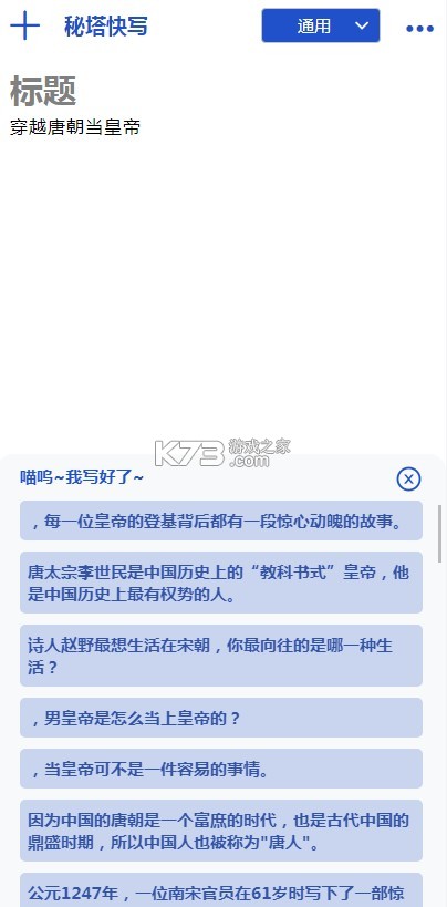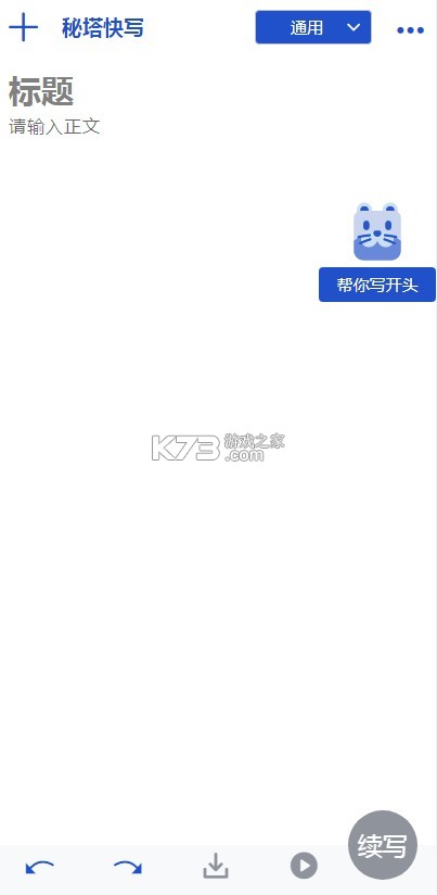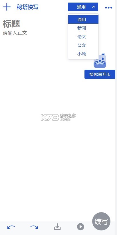 《秘塔快写》免费下载支持手机版网页版共同使用了,秘塔快写--ai智能创作平台支持通用、新闻、小说、公文以及论坛快速写。可以帮你写开头,可以给你续写,更有顺序感,写出的文字也是通畅的,不会念不通,正经的智能写作平台,交出更多让你满意的文字文章可以。