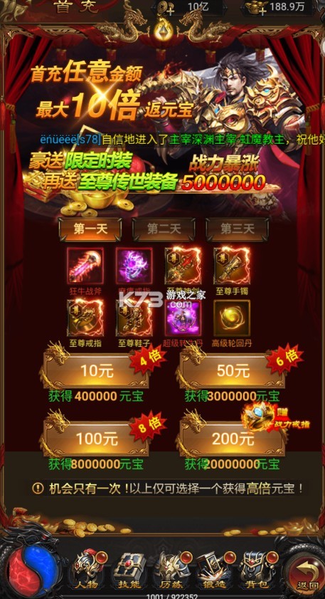 独家礼包:恶魔令牌*10、洗髓丹*10、血龙魄珠*10