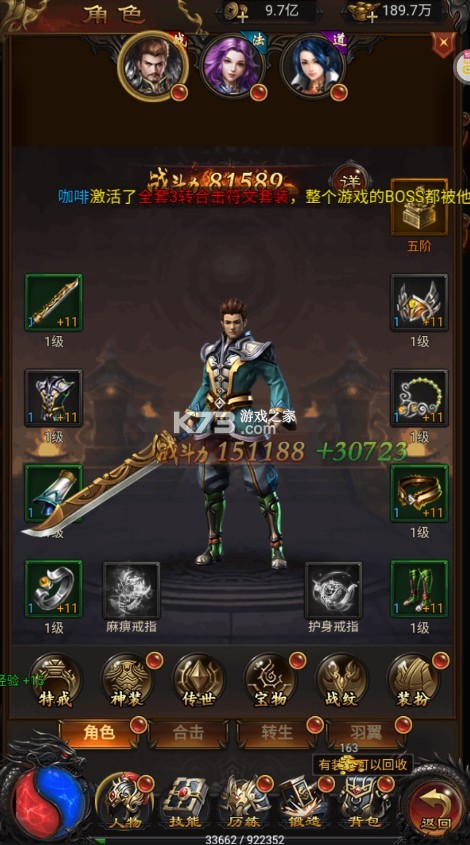 4、将一大陆的称号,神器和盾牌升满,可以获得暴击、攻速和刀刀吸血等大量强力属性!