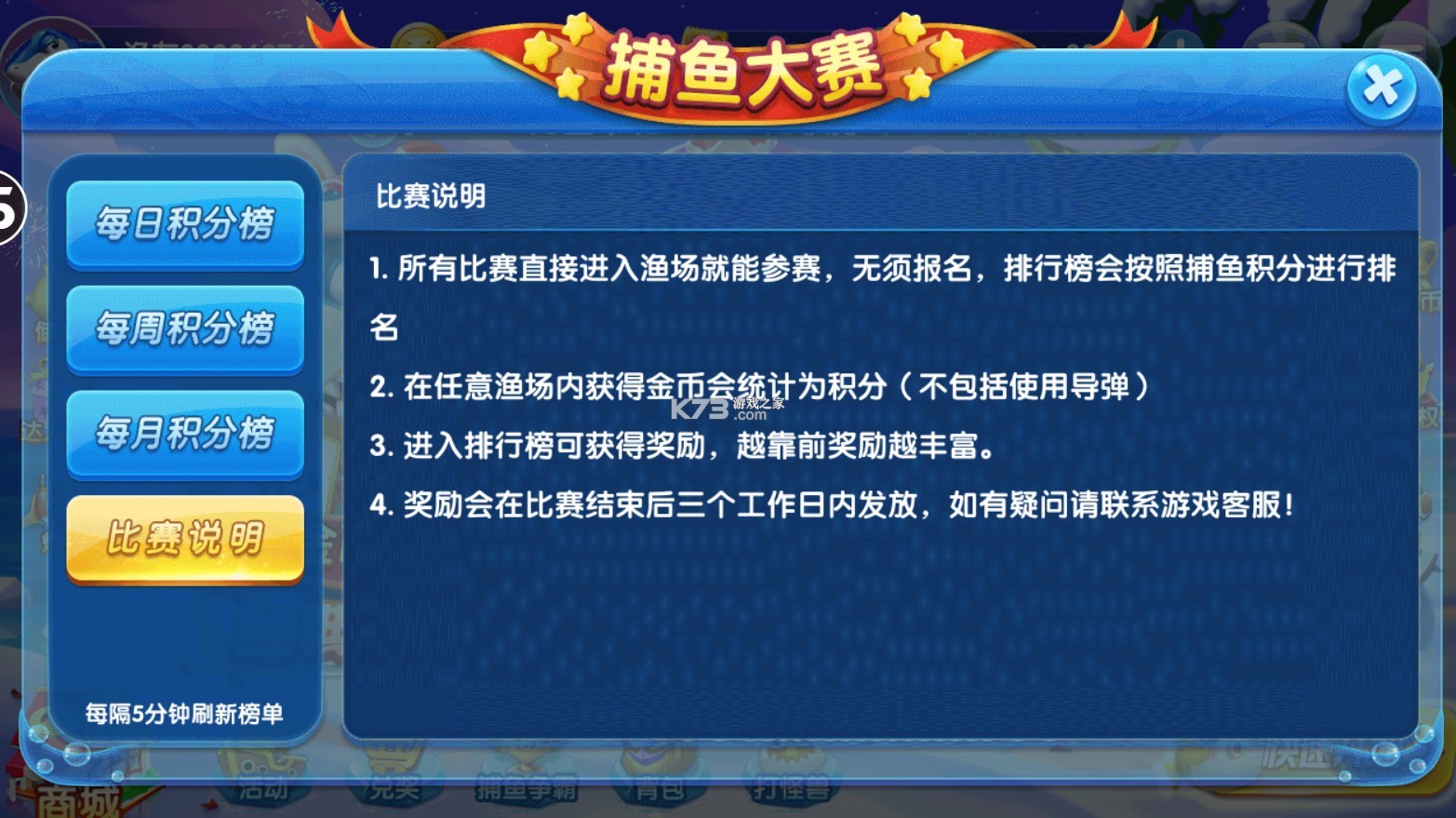 1.所有比赛直接进入渔场就能参赛,不需要报名,排行榜会根据捕鱼积分进行排名
