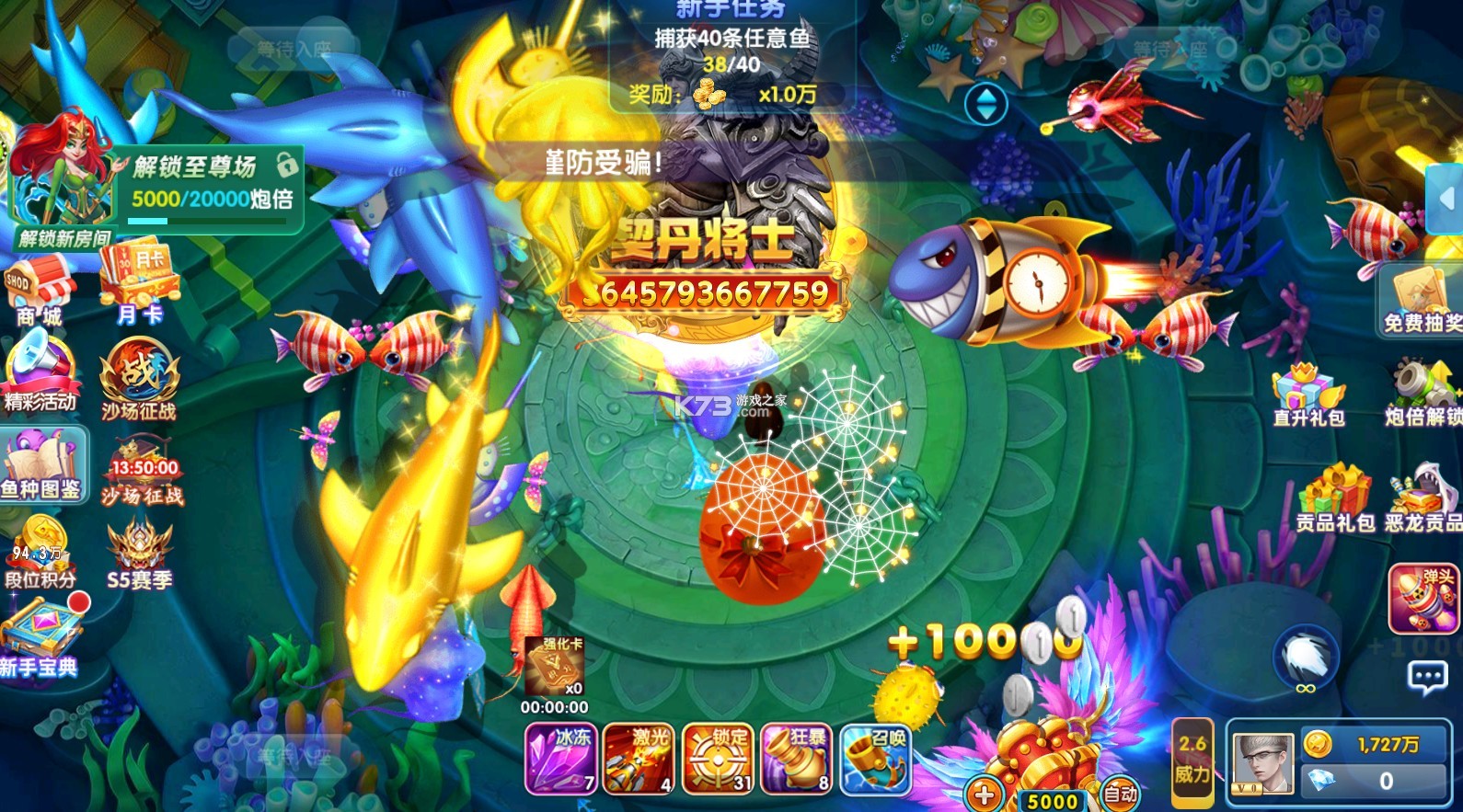用超强千倍炮对抗神秘的海底BOSS,独创技能狂暴分身轰翻全场,无论何种BOSS都一网打尽,称霸深海!