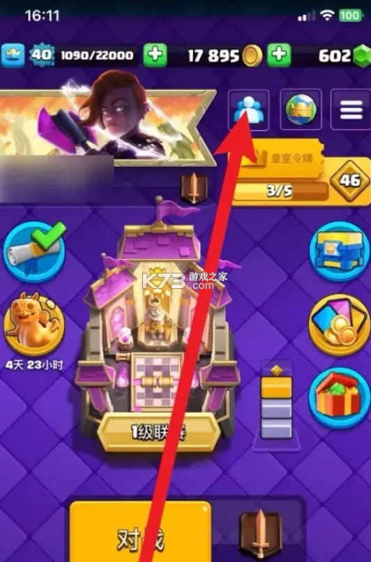 打开皇室战争游戏界面,点击上面的【人形】图标。