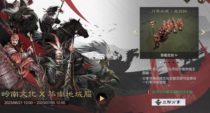 地域主题服首次开启期间,特别为全服主公准备了免费获取五虎将醒狮行军外观的活动。所有参与分享的主公皆可任选一个五虎将醒狮限时行军外观,在沙场演绎关羽狮与张飞狮的对决。