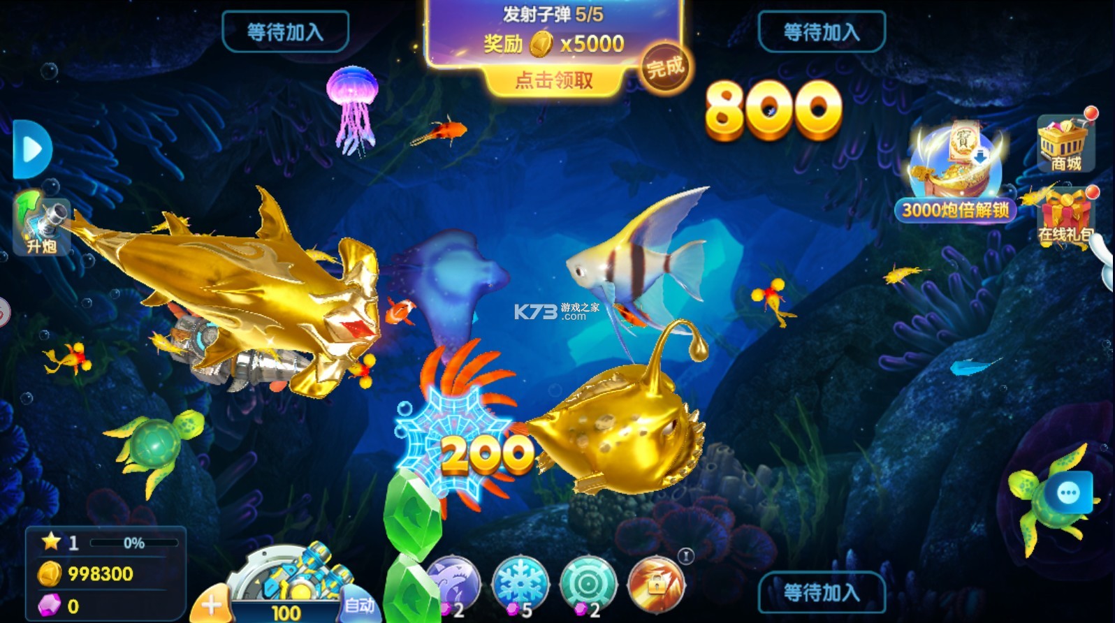 全新的美术风格、尽享3D视觉盛宴:特殊事件、武器狂暴、欢乐摇奖和潜水艇各种新奇玩法都会让你爱不释手!把你带入前所未有的逼真3D海底世界,尽显捕鱼达人本色!