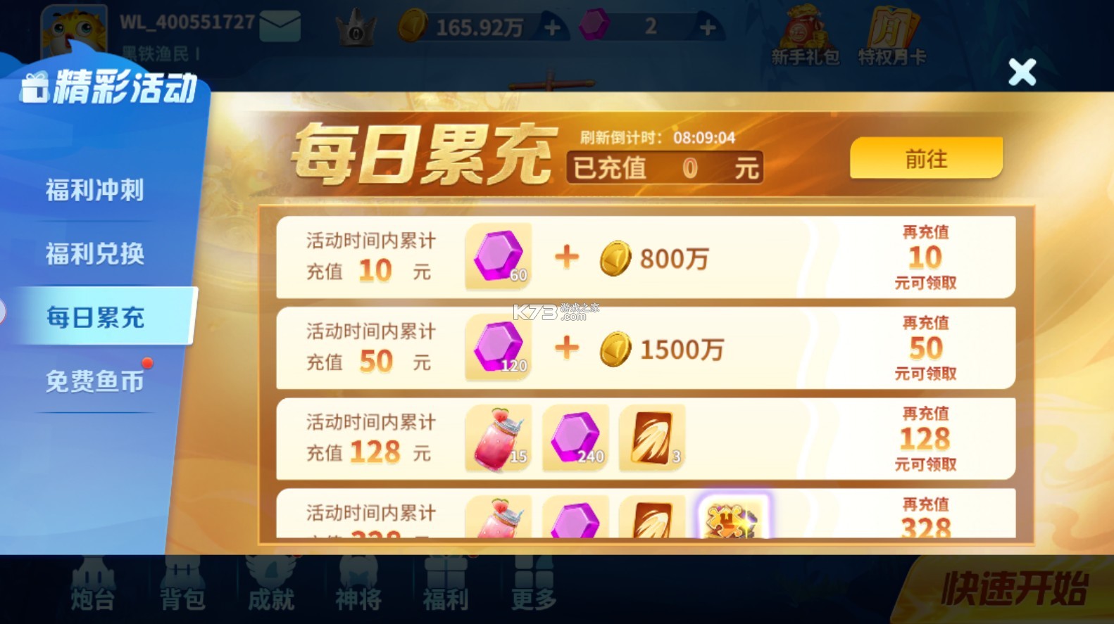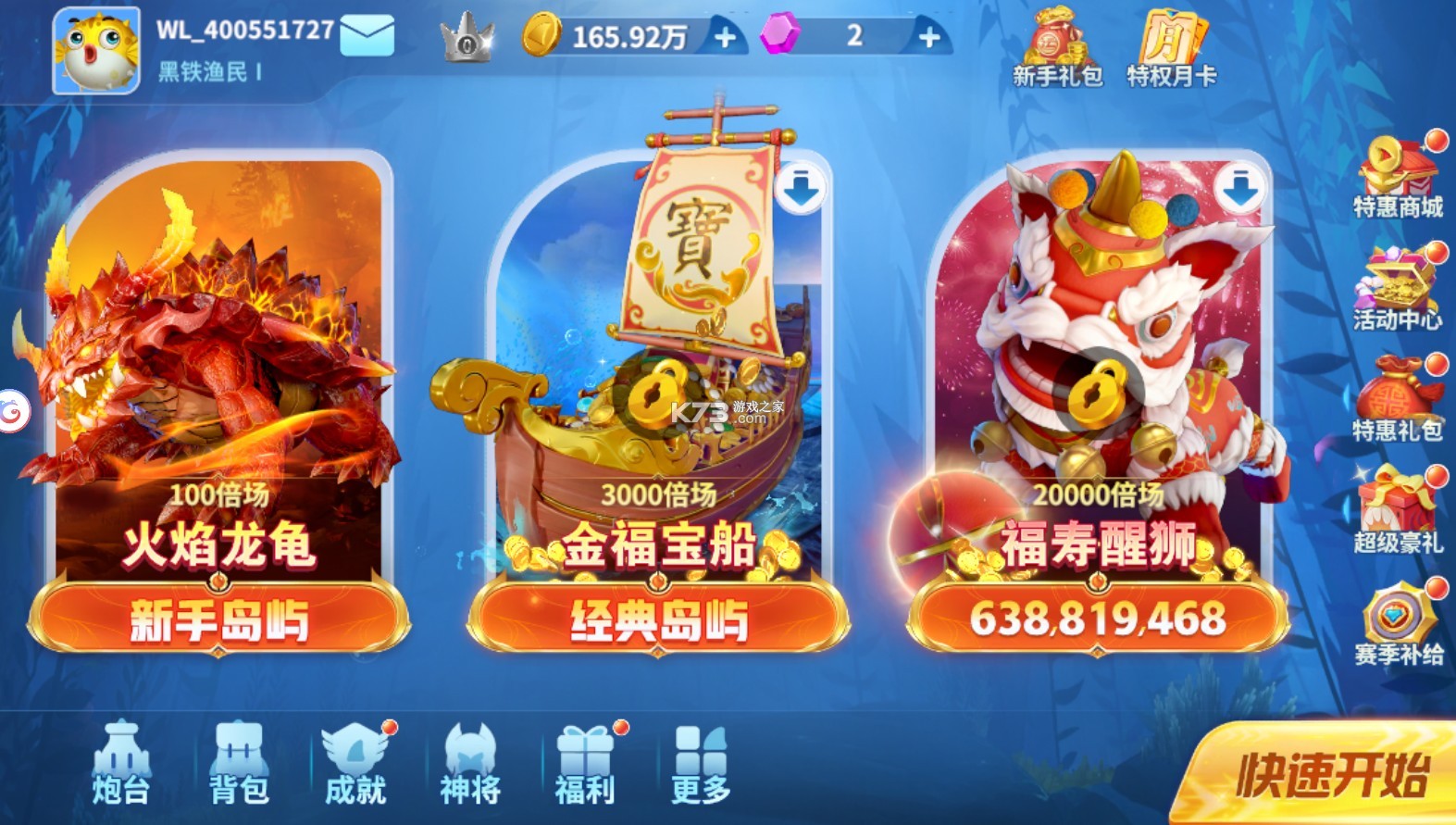 6.“首充豪礼”新装上阵,购买礼包领三天海量鱼币,更有炫酷炮台翅膀额外送。