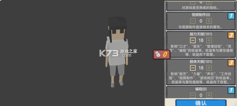方块人的简单生活就是生活与属性3,是属性与生活系列模拟经营游戏的新作,在前两作中,玩家可以干销售、当教练,或者做个游戏程序员,但在属性与生活3中,你可以成为一名能带货、能打游戏、能唱歌的互联网主播,在游戏初期,你身无分文,想要成为主播,首先得需要一个房间和一台电脑,所以你将从超市开始做兼职,在挣到第一桶金后,你可以进行贷款和理财,贷款后租下一间房子,置办电脑、家具,成功落脚之后你也不能放松,你需要利用空闲时间锻炼身体,为接下来的高强度工作打下坚实的基础,同时还需要进行厨师技能的学习,为之后食粮做好准备。在这个过程中,你一定要注意身体健康,身体是革命的本钱,一旦疲劳病倒,你可承担不起“天价”的医药费。同时对于“属性”的追求上,你需要将你的音乐和声乐提高,在开播之前,你还要创作歌曲,做好一切准备之后,你就可以开启你的主播致富之路了!