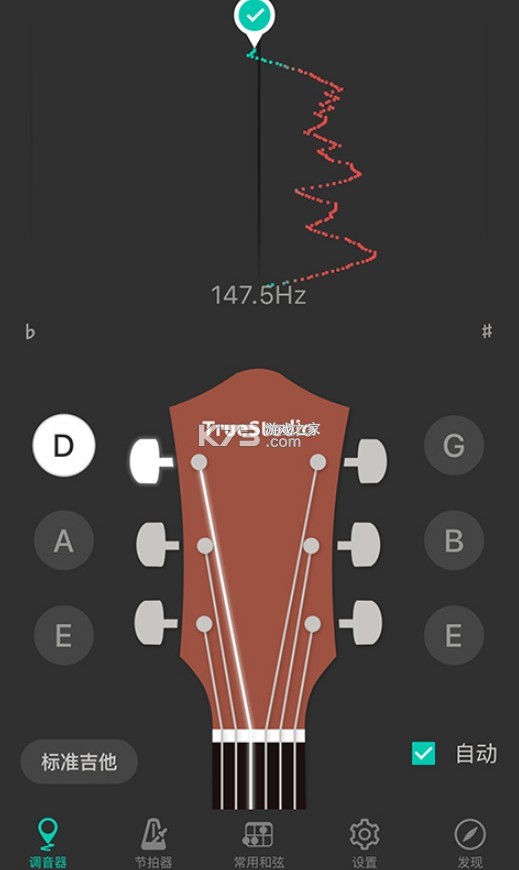 APP主页面显示着乐器的琴头。当弹拨某根弦时,APP会识别当前正在弹拨的弦,并指示出弦偏高还是偏低。根据提示依次调各个弦。