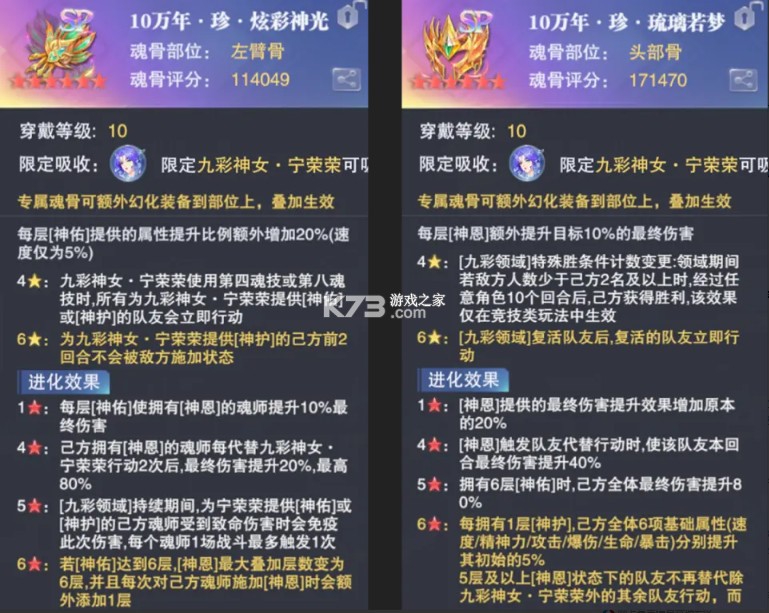 4-1技能:只要是提供“神恩”的增伤效果,神恩基础最高5层,在左臂进化魂骨的支持下可以做到最高6层,不过需要6“神佑”的支持,那么“神恩”除了不错的单体增伤效果外,最大的作用便是3层后即可永久维持,4层后即可让自己获得的有益buff不在消失,这个效果也是目前PVE下的最BT效果,5层后则会替代全部队友行动,这个效果目前属于一个负面效果,如对于卡妖树等打法非常不利,所以一般打长图这个技能都带9万年的,但如果大家有SP宁荣荣的头部进化魂骨则可以避免这个困扰,直接上10万年即可4-2技能:主要提供【九彩领域】的综合辅助,其具备回血、复活、SP宁荣荣本体不死、10回合直接获胜等BT效果,不过客观说目前在80级前的部分PVP玩法下,其10万年的10回合直接获胜还是有几率能触发的,但在80级后的PVP战斗中,靠领域直接获胜的战斗数量则会下降不少,大家注意即可