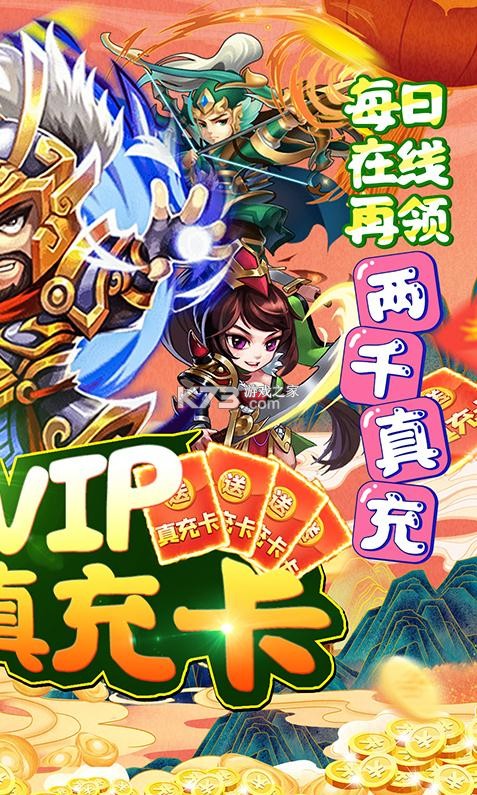 最新三国策略卡牌《一路三国-送金将万充》来袭,游戏内融入了众多历史名将以及经典战役元素。游戏画面丰富美好,色彩鲜明。融合放置类游戏经典的同时还包含了丰富的游戏内容:放置、战斗、收集,养成、任务、竞技场等!战斗过程无需操作,阵容搭配充满策略性。现在登录游戏创角就送满级VIP(VIP15)、一万元真充卡。次日送无双金将,七日送金将左慈,每日在线额外领2000元真充。福利满满,助您探索三国世界!