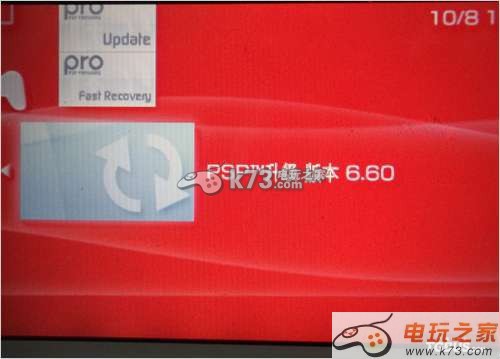 接着我们只需要将PSP与电脑的连接断开,在游戏中找到ProB的升级程序,进入。在这里为大家示范的是官方6.60系统刷6.60Pro B-10,其他版本也请参考以下程序进行刷机。(Update是升级程序,Fast Recovery是PSP关机或者各种原因断电后重启时快速刷回Pro自制程序用的。)