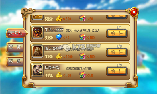 在我们进入游戏后首先看到的是一个岛屿和大海还有各种美丽的风景。而今后我们的勇者之旅就是从这里开始了。而升级和大多数手游一样升级是靠每日任务,各种活动和下副本。
