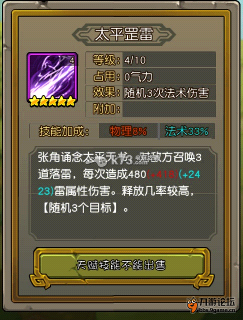 张角是我们得主力法系输出了,技能一放,必死三个(装备要跟上)法系成长也不错,但是耐力成长不够看啊,一个技能打到就要说拜拜了,防御装备多放点也许可以弥补这一缺陷