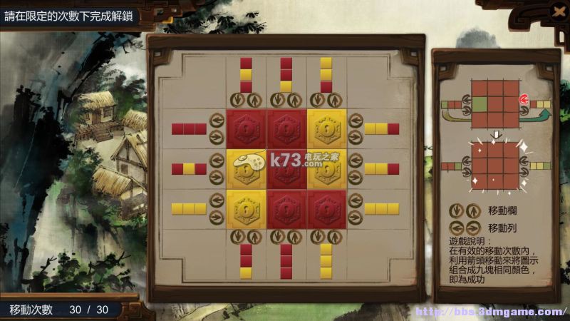 建议玩法:九格的四个边缘都能够进行上下或左右的移动,在移动键位旁边能够看见下一次移动后,这一行或列或出现的变化。