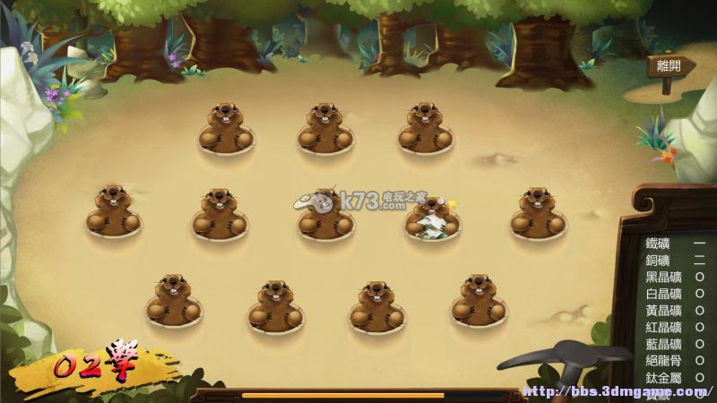介绍:(限时小游戏)传统的打地鼠游戏,每一回合只有一只地鼠抱着矿石出现,在所有地鼠的头缩回地底时敲打那只抱着矿石的地鼠的头。