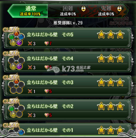关卡选择介面,难度分为通常、困难、鬼难,普通副本在十二章节突破之后会开启下一阶难度,有显示关卡属性、波数、耗费体力以及成就星数,通常一个关卡可以拿到一颗鬼咒石、一个章节结束时达成率100%会给予五颗鬼咒石作为奖励