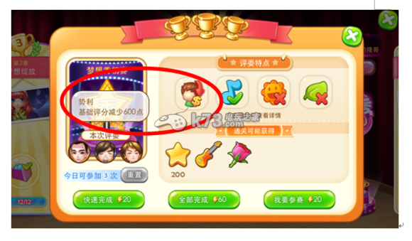 (1)红圈圈出的是额外的技能,有的嘉宾和所有的梦想秀比赛都会有特殊的技能影响,有的是一个,有的是两个,大多数情况下这个技能可以说是负面BUF,比如小编截图的就是初始分为-600,还遇见过-1000的,还有的是会将某种风格错看成嘉宾讨厌的风格,等等各式各样的影响技能。