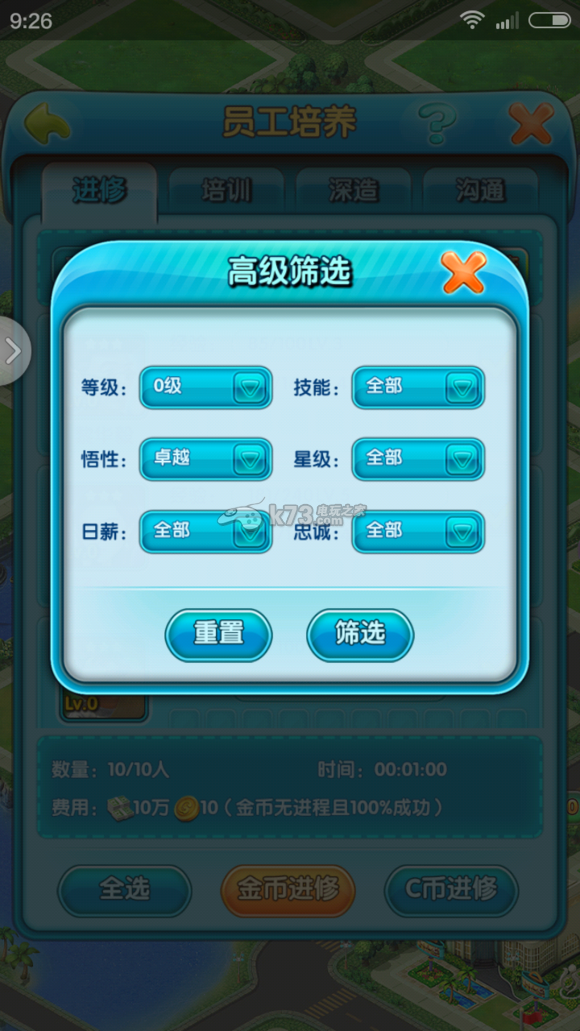 这是很多新手忽视的问题,因为员工有几百个,新手往往不知道从哪培养开始,一般来说,2星卓越,3星优秀以上就值得培养培养了,点击事务,员工培养,全体员工,右上角那个筛选,就能打开这个